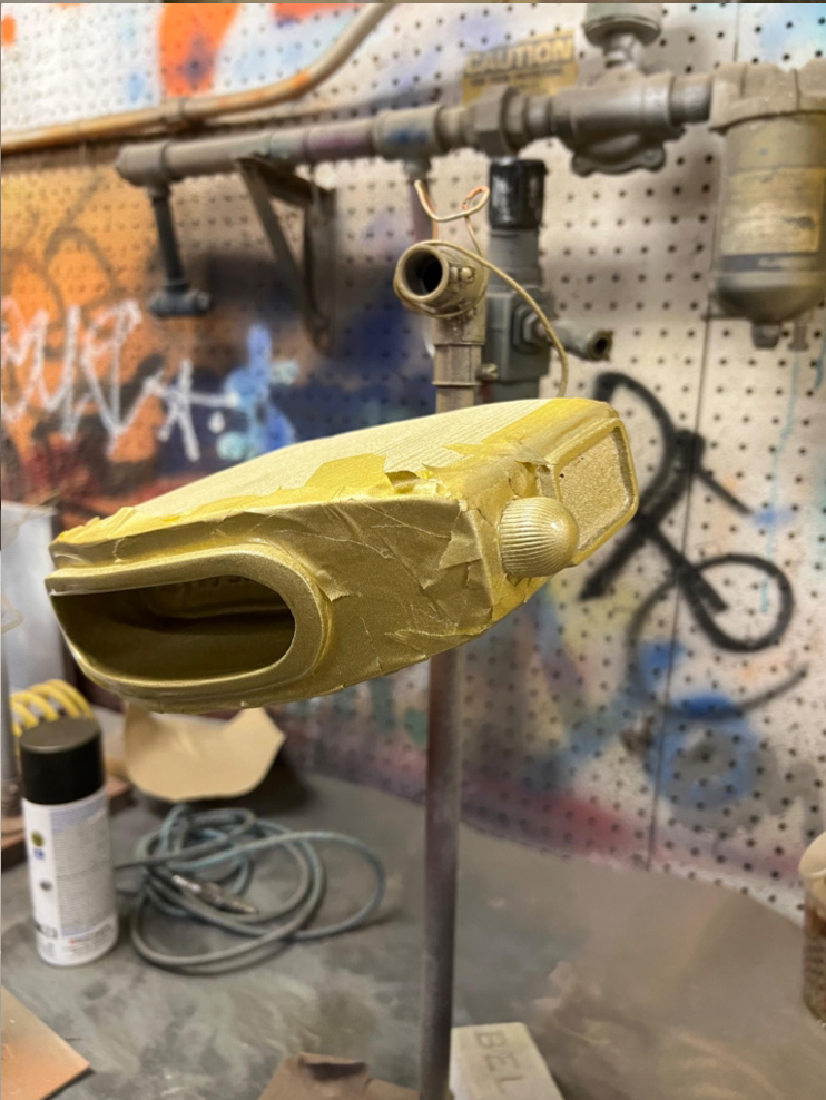 After getting the model as even as it could get with Bondo, it was time to prime. Priming is a step in the painting process that helps seal and prepare the model for paint. This step gave me a nice, even base color tone to start with. I used Rust-Oleum Painter’s Touch 2X Ultra Cover white spray primer, which took almost 12 hours to dry fully.