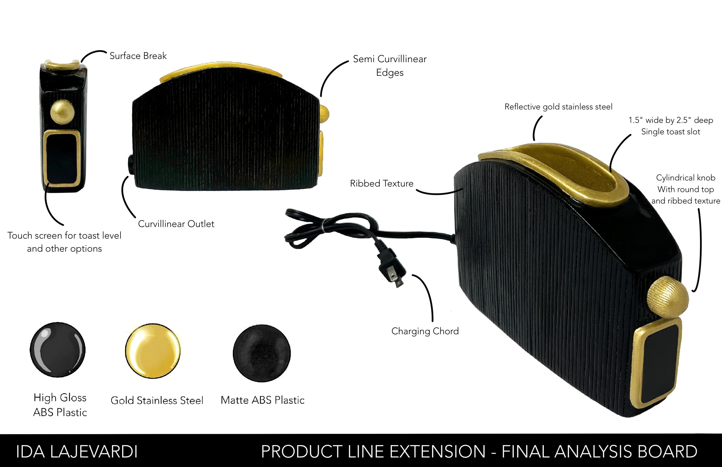 I explored how to transform the Tom Ford perfume bottle into another product using the same design language. I sketched various products, such as kitchen knives, kettles, and other kitchen accessories. I landed on toasters since I found out that there’s more to be done with them. I had more flexibility in playing with the form, colors, finishes, and transitions.